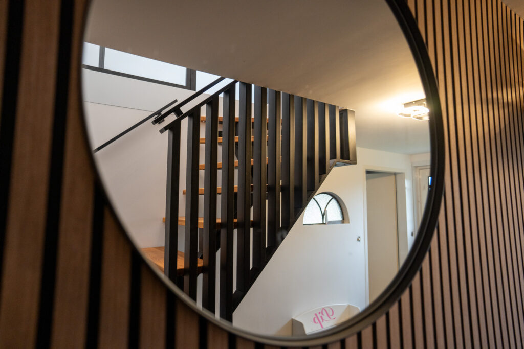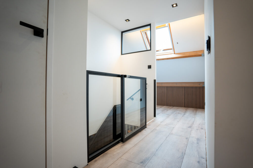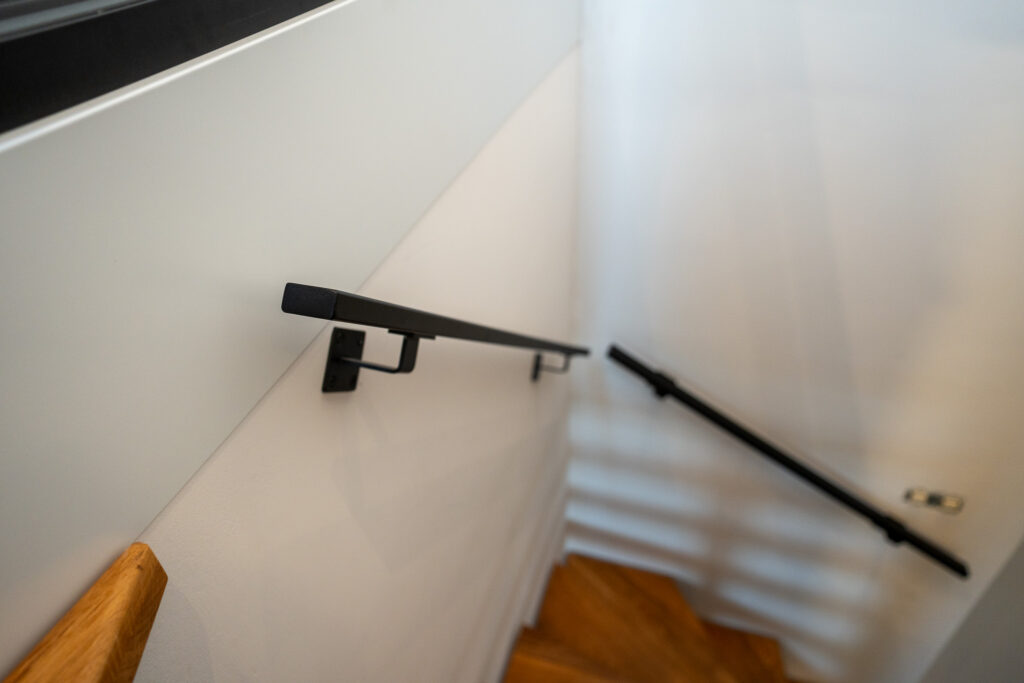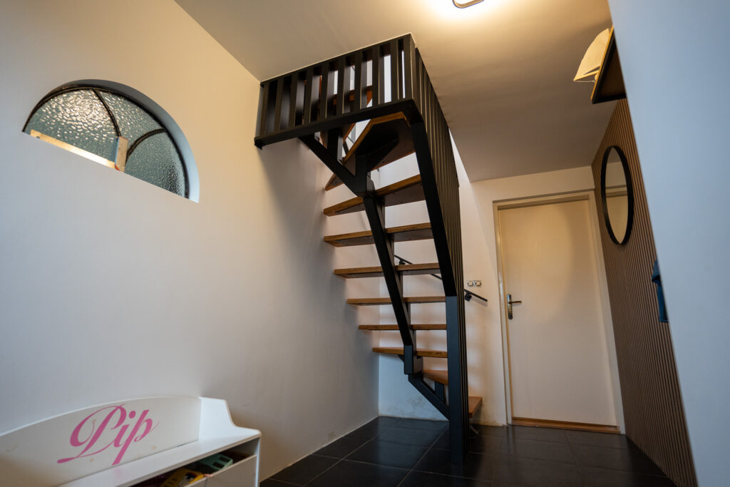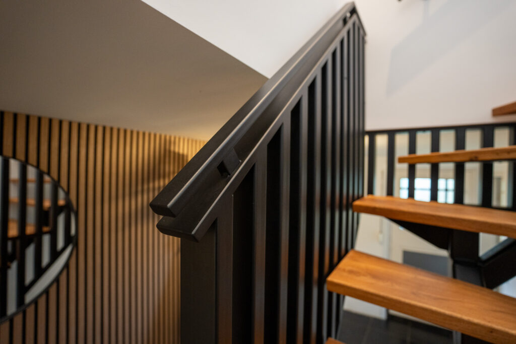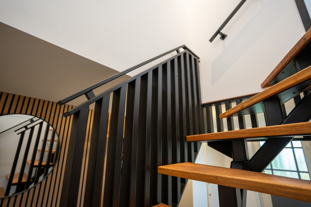 Elke trap wordt bij J&J Metaal volledig op maat ontworpen. Voor dit project hebben we een bijpassend traphekje van veiligheidsglas en een bijpassende balustrade gerealiseerd. Zo ontstaat een samenhangend geheel waarin design en praktische veiligheid perfect samenkomen. De houten treden zorgen voor warmte en contrast, terwijl het staal een moderne, industriële uitstraling geeft.